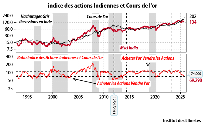 Aujourd’hui, les Indiens sont sans doute en train de se préparer à acheter des actions en vendant de l’or puisque nous venons d’atteindre un point d’achat sur les actions contre l’or.