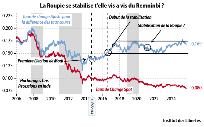 La ligne bleue le taux de change ajusté pour la différence des taux courts. Si l’Inde a des taux à un an à 6% et la Chine à 1%, et si la roupie baisse de 5 % alors la ligne bleue restera horizontale. Si la ligne bleue baisse, cela veut dire que l’Inde dévalue contre la Chine, si elle monte que l’Inde réévalue, et si elle est à plat que rien n’a changé, les taux courts compensant exactement la variation des taux de change.