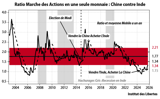 Après tout, si les Indiens sont rentrés dans le système monétaire Chinois, il parait raisonnable d’espérer une baisse des taux longs Indiens qui convergeront vers les taux Chinois, ce qui ne ferait pas de mal aux actions Indiennes, bien au contraire.