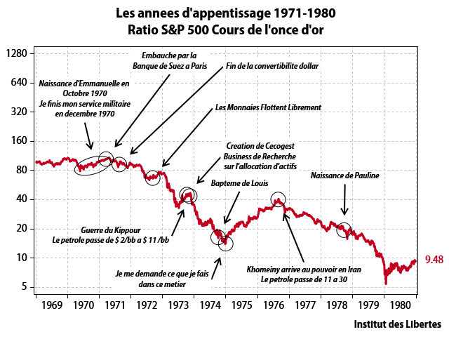 Les dix premières années de ma carrière furent … riches d’enseignements, le ratio entre l’indice S&P 500 et le cours de l’or passant début 1972 à …9,48 en décembre 1980 (-90 %). C’est ce que montre mon premier graphique, dans lequel je mélange vie personnelle et évènements historiques car ma chère épouse eut la merveilleuse idée de m’offrir trois beaux enfants pendant cette période.