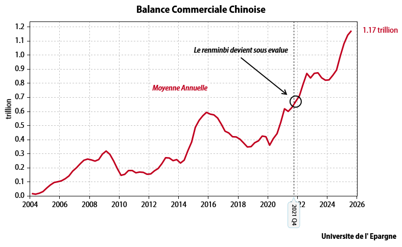 Et du coup le déficit commercial de la zone euro vis-à-vis de la Chine a quasiment triplé, passant d’environ 110 milliards par an à un peu plus de 300 milliards par an tandis que les excédents commerciaux de la Chine vis-à-vis du reste du monde dépassaient 1200 milliards, ce qui est tout simplement insensé.