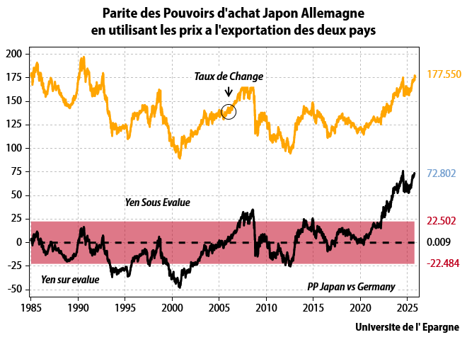 Mais on voit bien que la ligne noire s’en écarte et que de temps en temps l’écart devient suffisamment important pour essayer de gagner de l’argent sans travailler, en pariant sur un retour du taux de change sur la parité des pouvoirs d’achat. Aujourd’hui le yen est sous-évalué par rapport à l’euro d’environ 25 % et nous sommes dans l’un de ces moments depuis un peu plus d’un an.